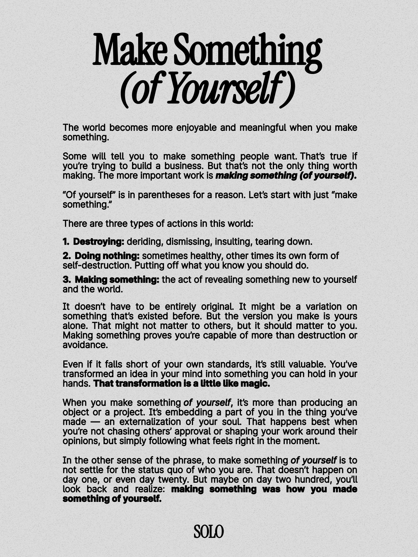 When you make something of yourself, it’s more than producing an object or a project. It’s embedding a part of you in the thing you’ve made — an externalization of your soul. That happens best when you’re not chasing others’ approval or shaping your work around their opinions, but simply following what feels right in the moment.